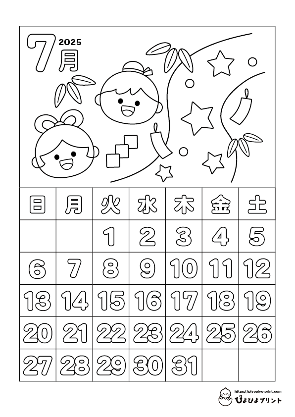 2025年7月 カレンダーぬりえぴよぴよプリント。