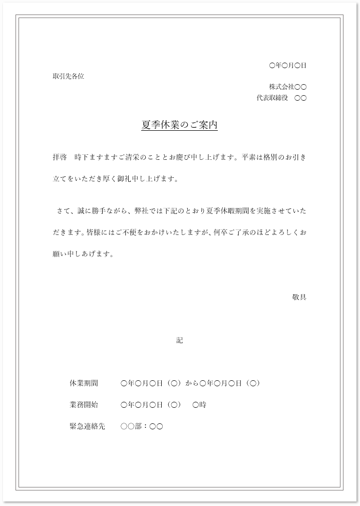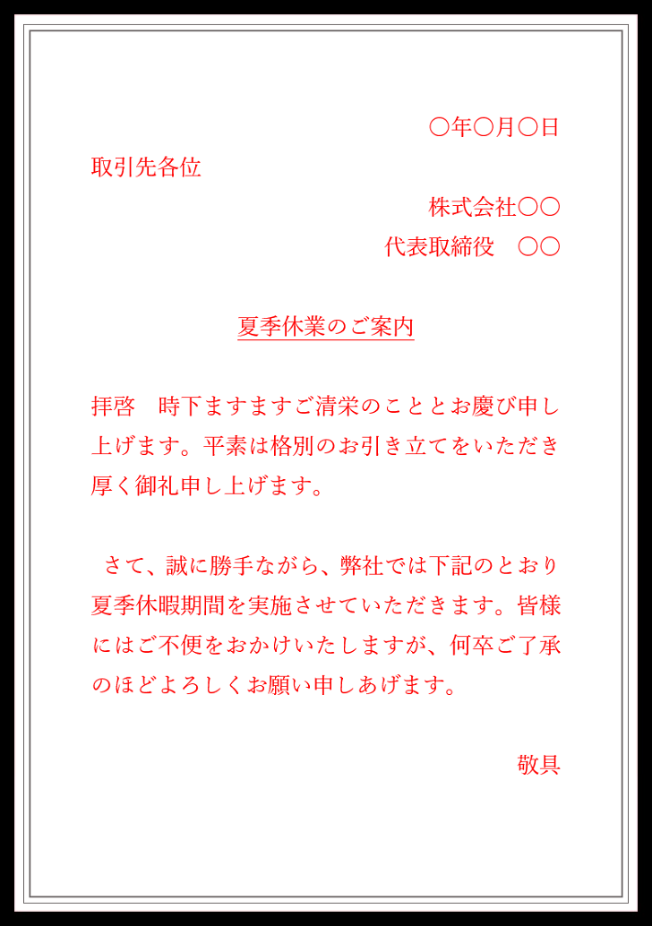 お知らせ 夏季休業 の書式テンプレート Word・ワードテンプレート・フリーBiz。
