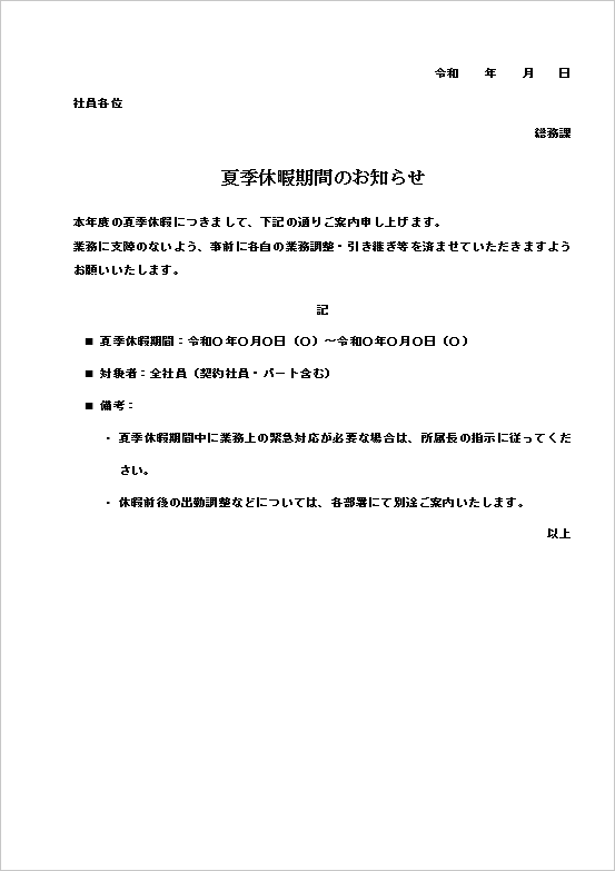 夏季休暇のお知らせテンプレート4選社内・取引先・掲示用に使えるWord形式テンプレートクローゼット。
