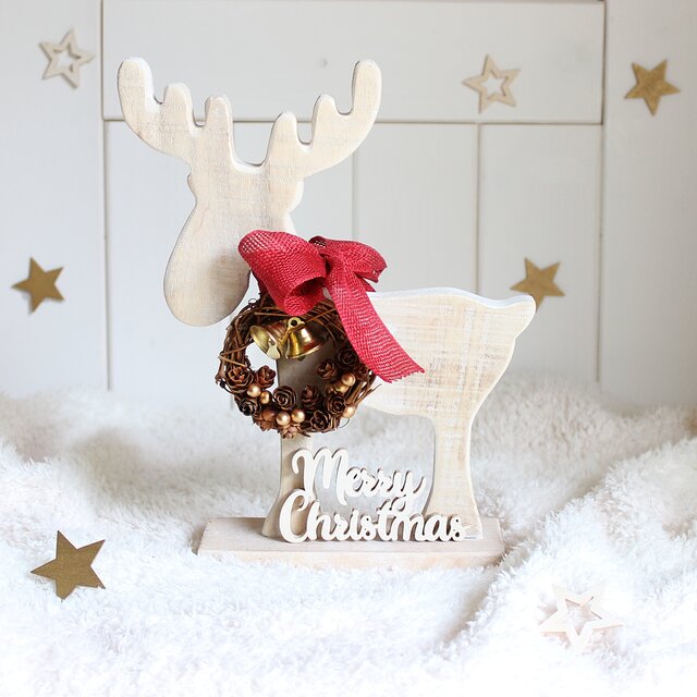ナチュラルウッド リースをつけたトナカイのデコレーション クリスマス飾り 置物 R&yCH117iichi日々の暮らしを心地よくするハンドメイドやアンティークのマーケットプレイス。