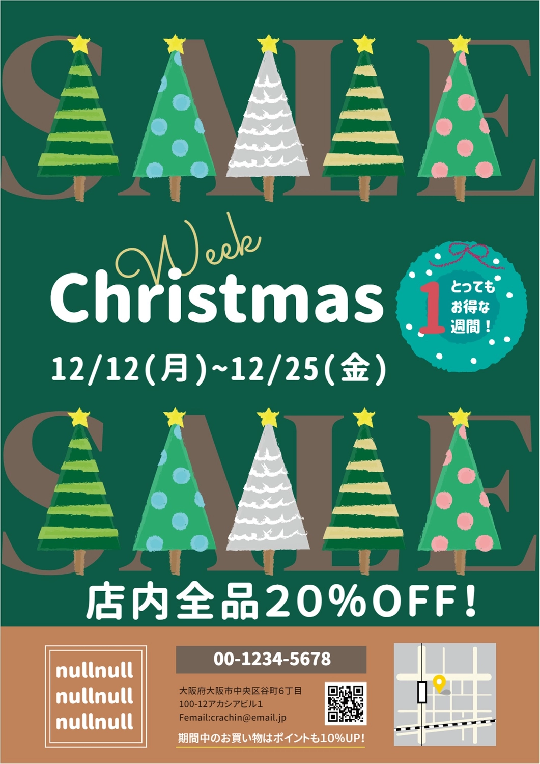 緑背景でクリスマスツリーイラストのセール向けチラシの無料チラシテンプレート 11273 - デザインAC。