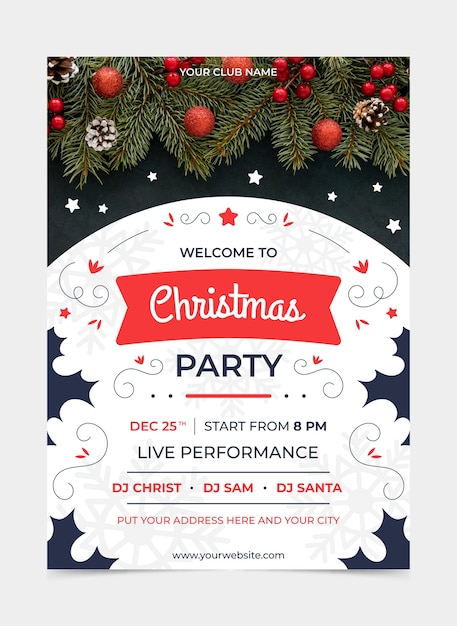 写真付きのクリスマスパーティーチラシテンプレート無料ベクトル素材。
