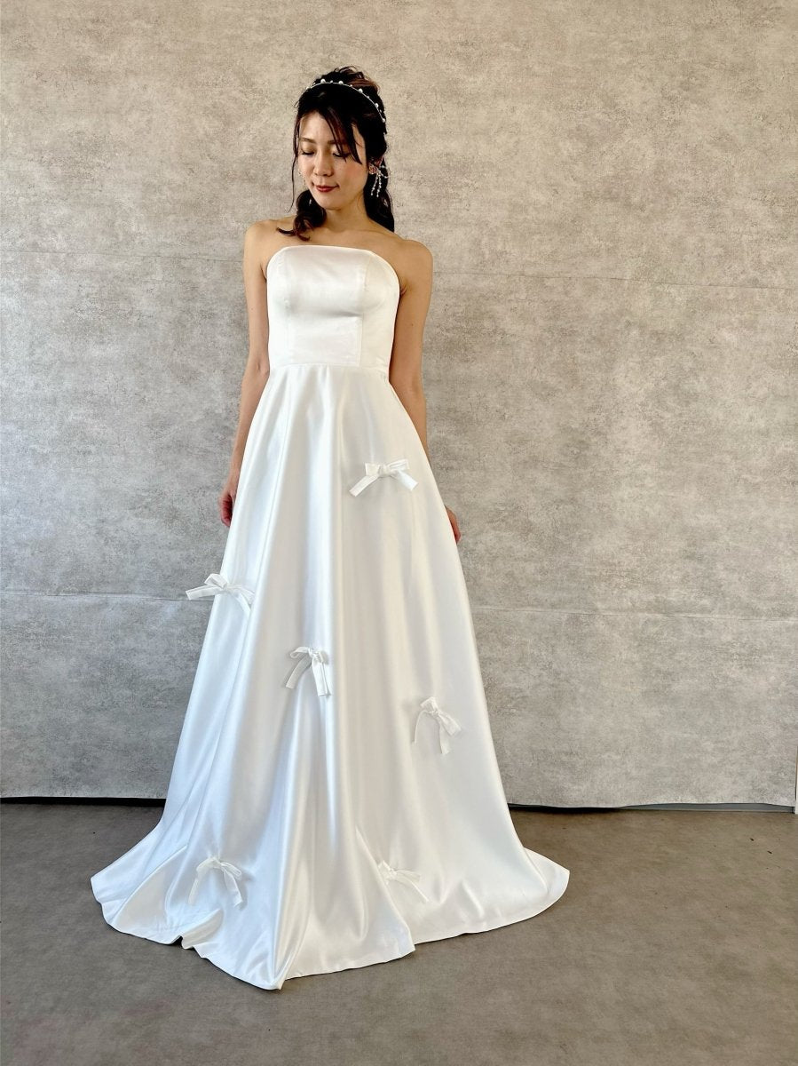 シンプルオシャレな大き目リボンのベア ウェディングドレス 上品でクラシカル。大人花嫁のため。