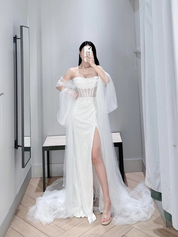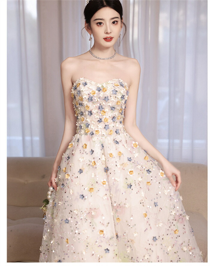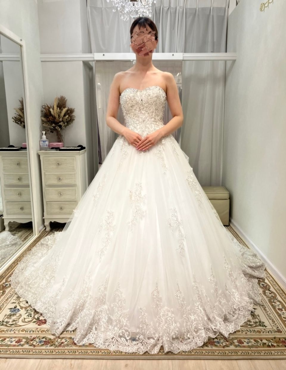 実例写真!抜群のおしゃれ見え ウエディングドレス ベアトップ 花モチーフ パール 華やかなトレーン 前撮りiichi日々の暮らしを心地よくするハンドメイドやアンティークのマーケットプレイス。