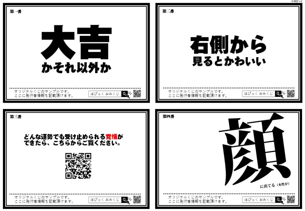 インパクト勝負!面白めのおみくじ文章 例文サンプルオリジナルおみくじ製作所 デザイン自在、サイズ変更可 AIテンプレあり 株式会社はぴっく。
