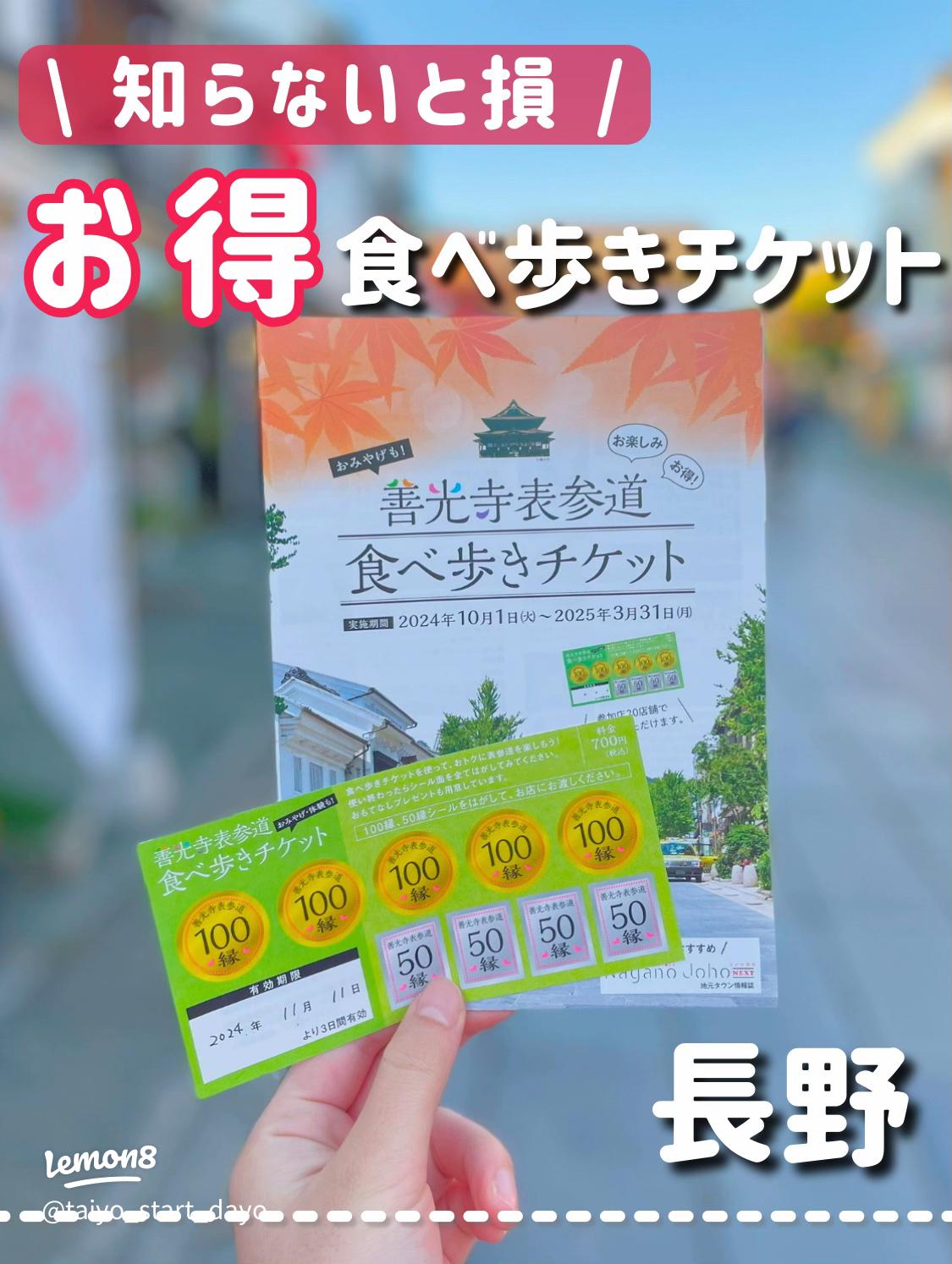 善光寺表参道食べ歩きチケットで長野グルメ堪能!,善光寺表参道食べ歩きチケット は、, 長野名物やスイーツなど、21店舗の中から,好きなものを選んで購入できる、, お土産にも使える✨お得なチケットです, 🌸使い方🌸, ①チケットを購入 1枚700円 税込,②パンフレット掲載店で、チケットに貼られた, シール 100円×5枚,50円×4枚 を商品と交換,。