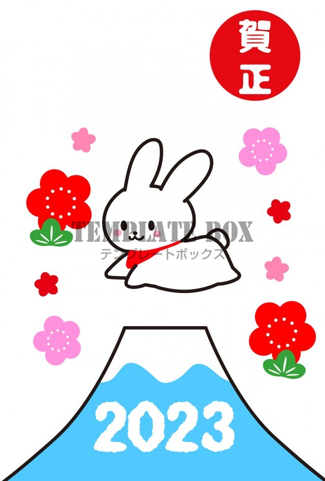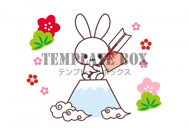 2023年干支卯年 うさぎ年 の年賀状・正月素材・富士山の上に絵馬付き破魔矢を持ったかわいいキャラクター風ウサギさんイラスト無料の年賀状素材TemplateBox。