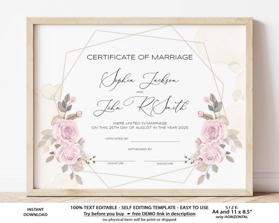 モダンな結婚証明書テンプレート、編集可能で印刷可能な水彩結婚証明書テンプレート、結婚祝い、即時ダウンロード、ジェット - Etsy 日本。