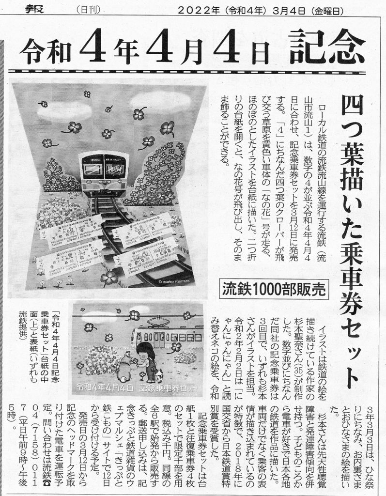 流鉄令和4年4月4日記念切符 新聞掲載。