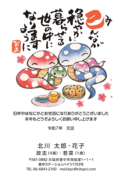 手書きの文字と絵で親しみやすい印象!2025年絵手紙風年賀状デザイン一覧大阪 きたがわぷりんと。