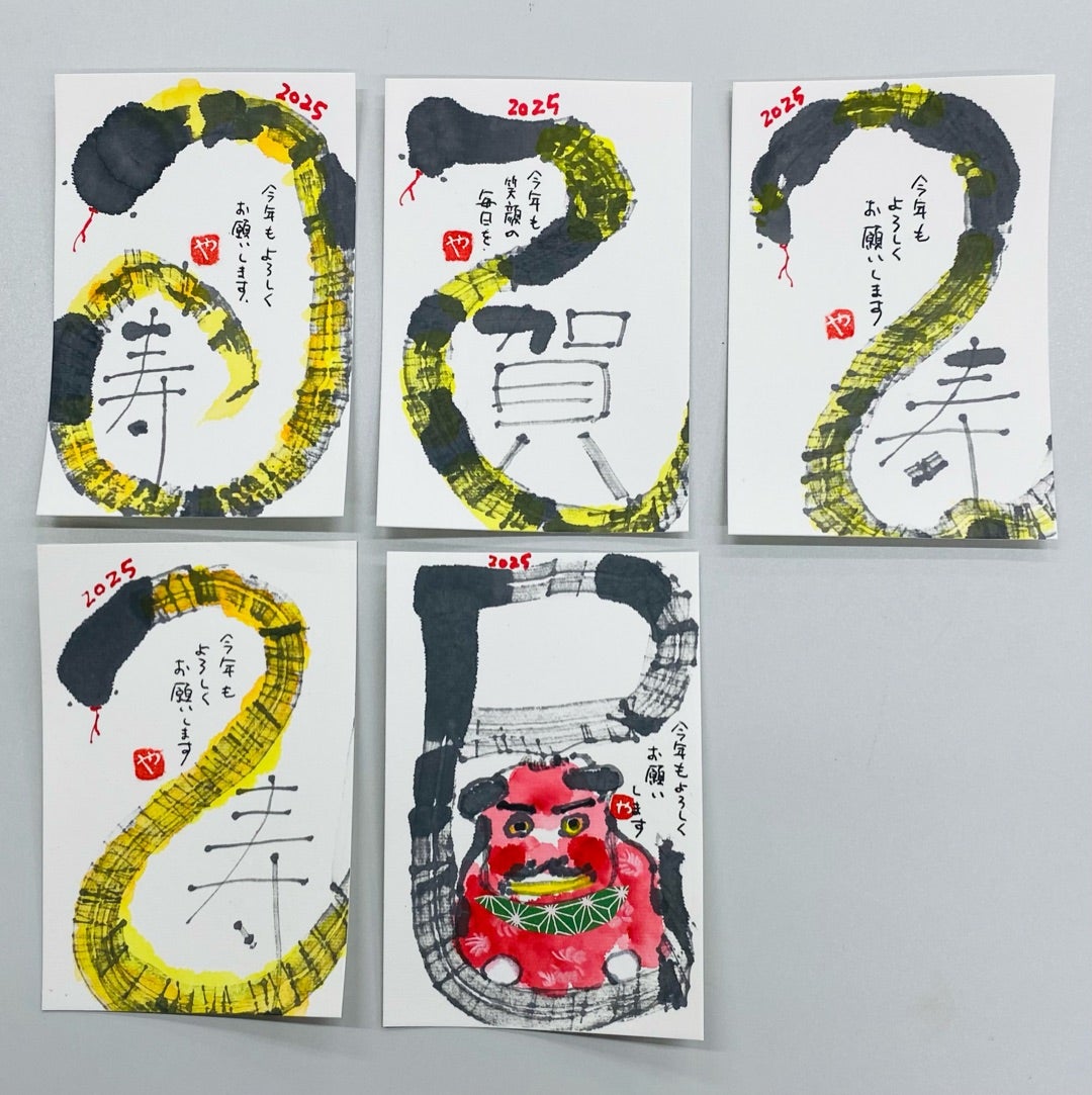 New Year's greeting card 〖まほろばオリジナル巳2025絵手紙年賀状 〗 今年も作成しました 。.:✤*゜ 巳年は可愛らしく𓆙。.:✤*゜ 。.:✤*゜代筆屋まほろば2025巳年オリジナル絵手紙年賀状手描き手書き毎年恒例。
