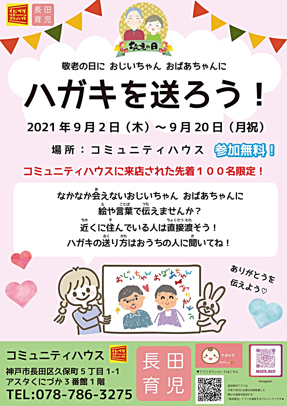 敬老の日におじいちゃんおばあちゃんにハガキを送ろう兵庫県神戸市長田区イベント。