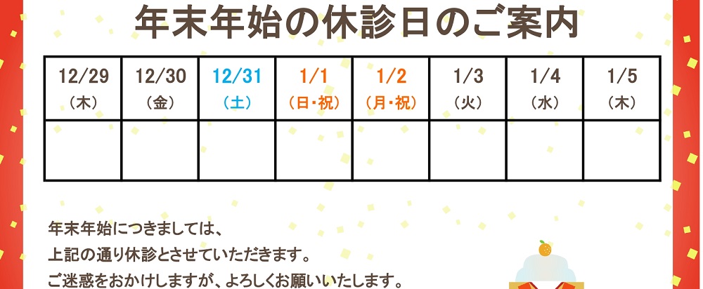 年末年始の休診日案内!無料テンプレート・長期休暇のお知らせを簡単作成!めでたい紅白のフレームとかわいいだるまのイラスト入り可愛いだらけ。