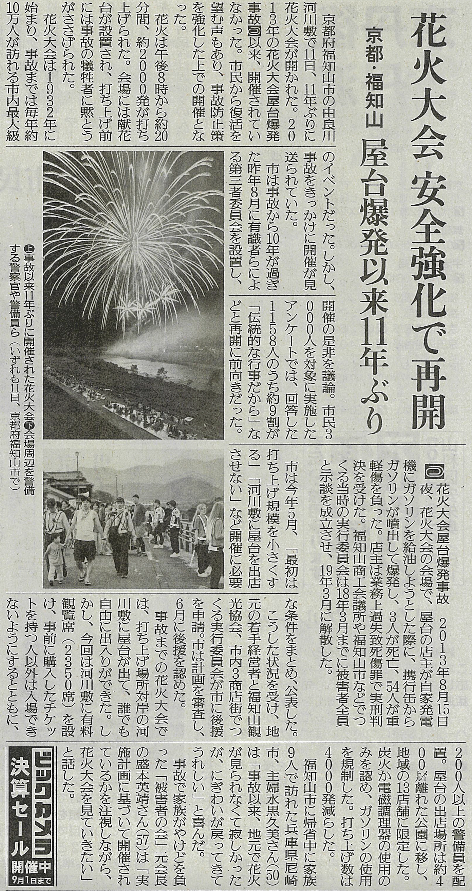京都・福知山の花火大会屋台爆発:「爆発事故 風化させない」 11年ぶり花火大会 京都・福知山毎日新聞。