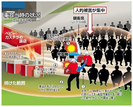 給油時、発電機出火か 京都・露店爆発 13歳少年重体 けが59人に 業過傷害容疑で捜査 - 日本経済新聞。