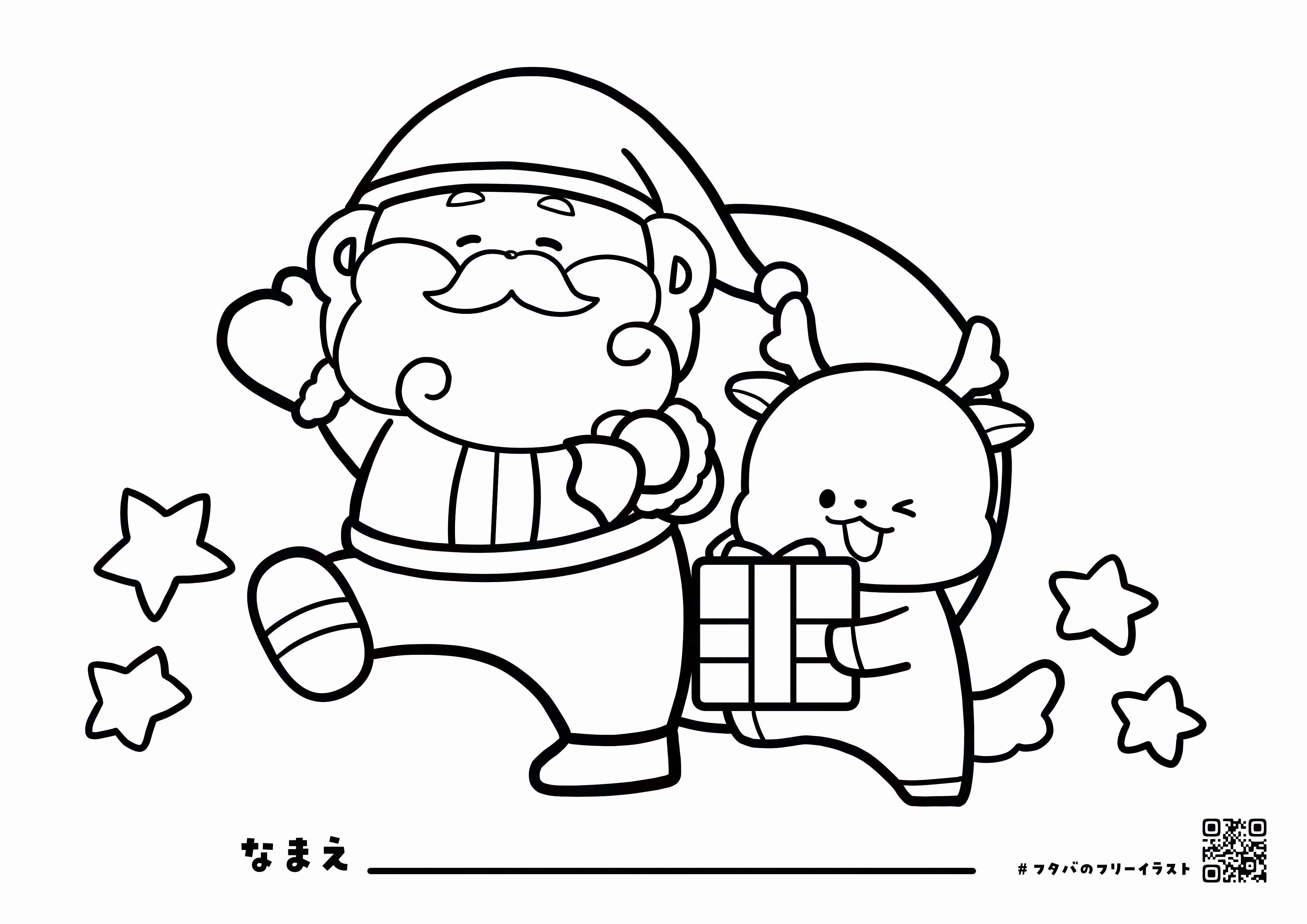 冬・クリスマス・ぬり絵・ワーク サンタさんとトナカイさんのハッピークリスマス塗り絵フタバのフリーイラスト。
