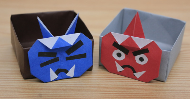折り紙簡単 可愛い 鬼の箱 豆入れ の折り方 ◇Origami Demon decoration box 節分 2月 行事 豆まき◇。