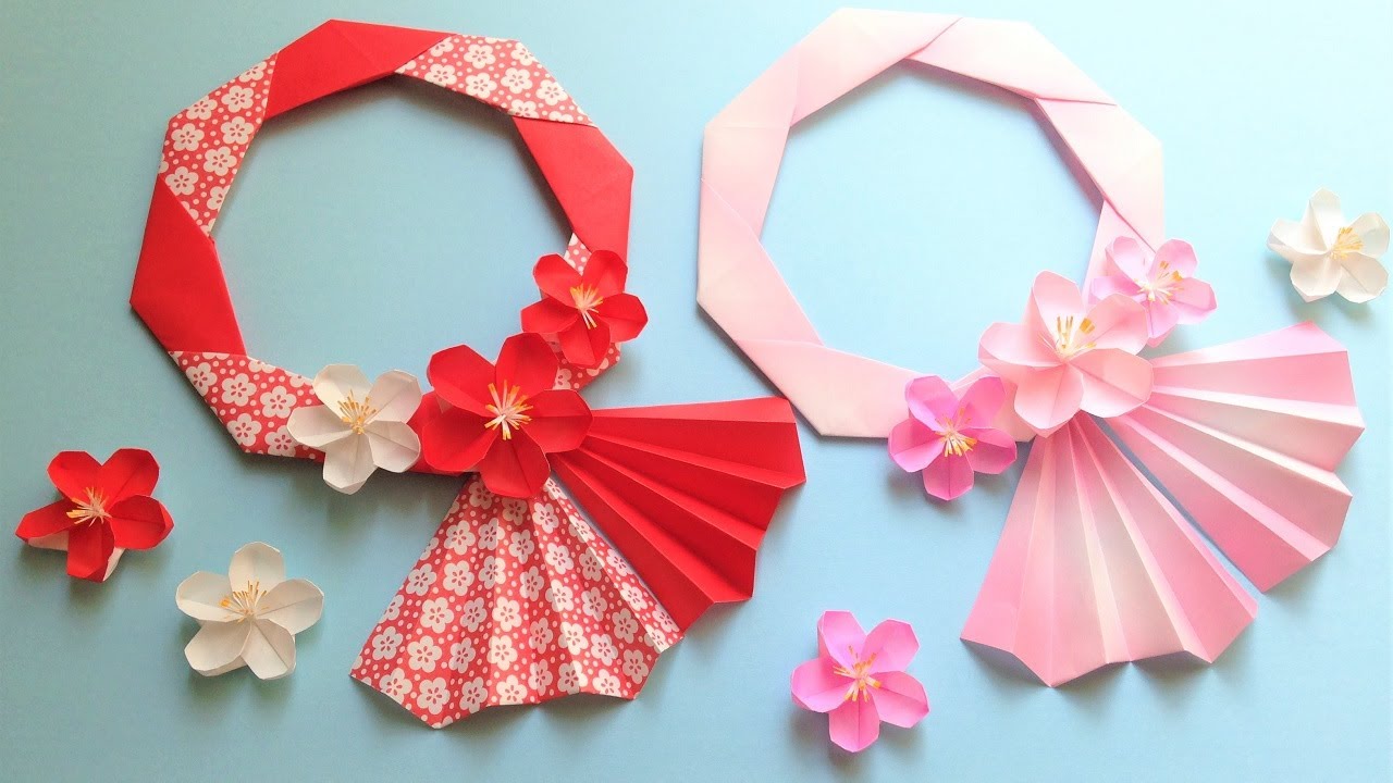 折り紙 お正月飾り しめ縄 梅の花リース 折り方 Origami decoration on New Year's day Plum Flowerwreath tutorial niceno1- YouTube。