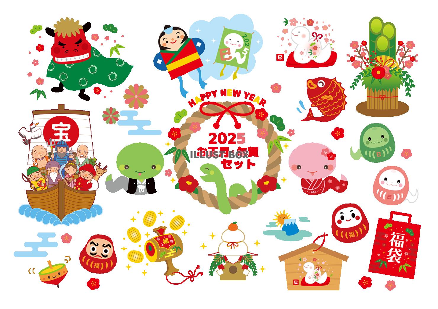 白蛇のまわりに色んなお正月 縁起物 かわいい2025 巳年イラスト無料 フリー91234素材Good。