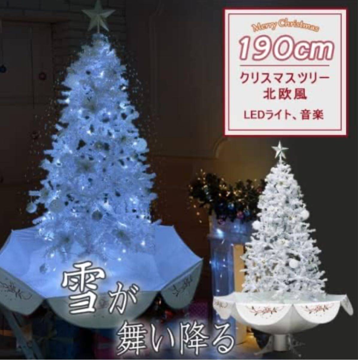 クリスマスツリー おしゃれ ツリー クリスマス 北欧 LED ホワイト 190cm 雪降り 音楽機能付き ライト イベント。