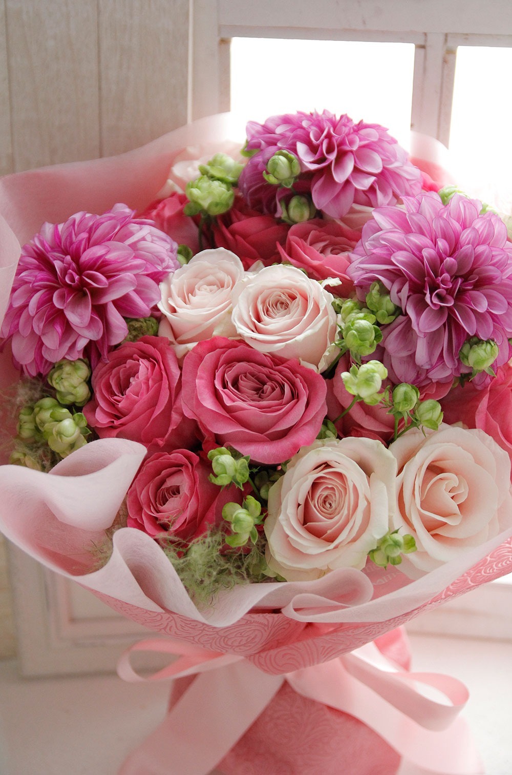 上品なイメージで」いつもお世話になっている方へのピンク色がメインのお誕生日お祝いの花束誕生日のおしゃれな祝い花。