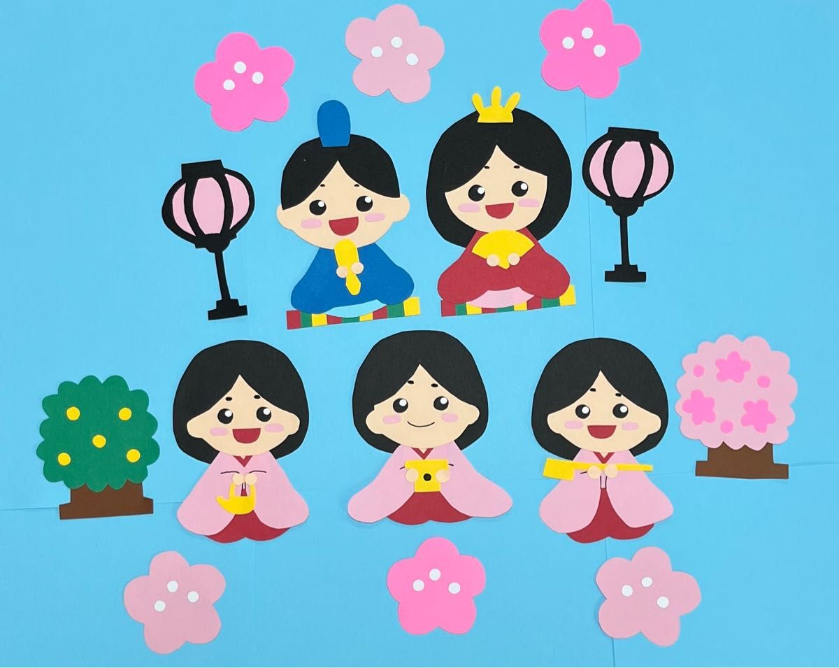 無料ダウンロード型紙で「ひなまつり 三人官女 三方」の壁面飾りを作ってみた!保育園 幼稚園 介護施設 壁面装飾 製作 春 雛祭り お雛様 3月壁面飾り型紙工房。