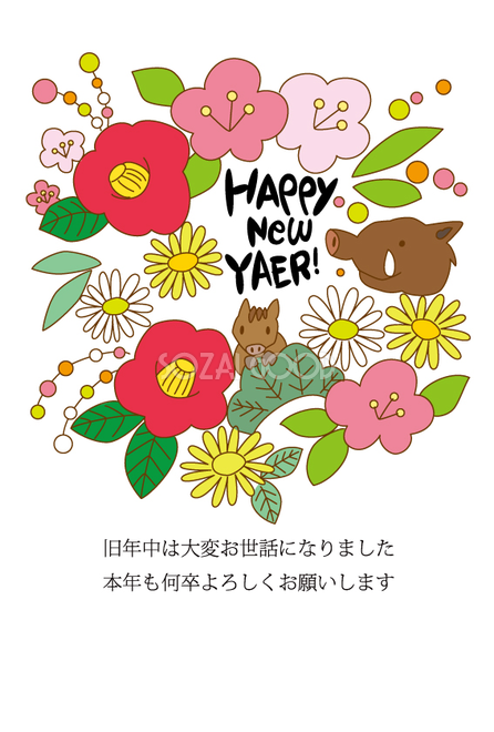 女性好みの華やかでかわいいイメージ亥年の年賀状テンプレート無料 フリー イラスト84479素材Good。