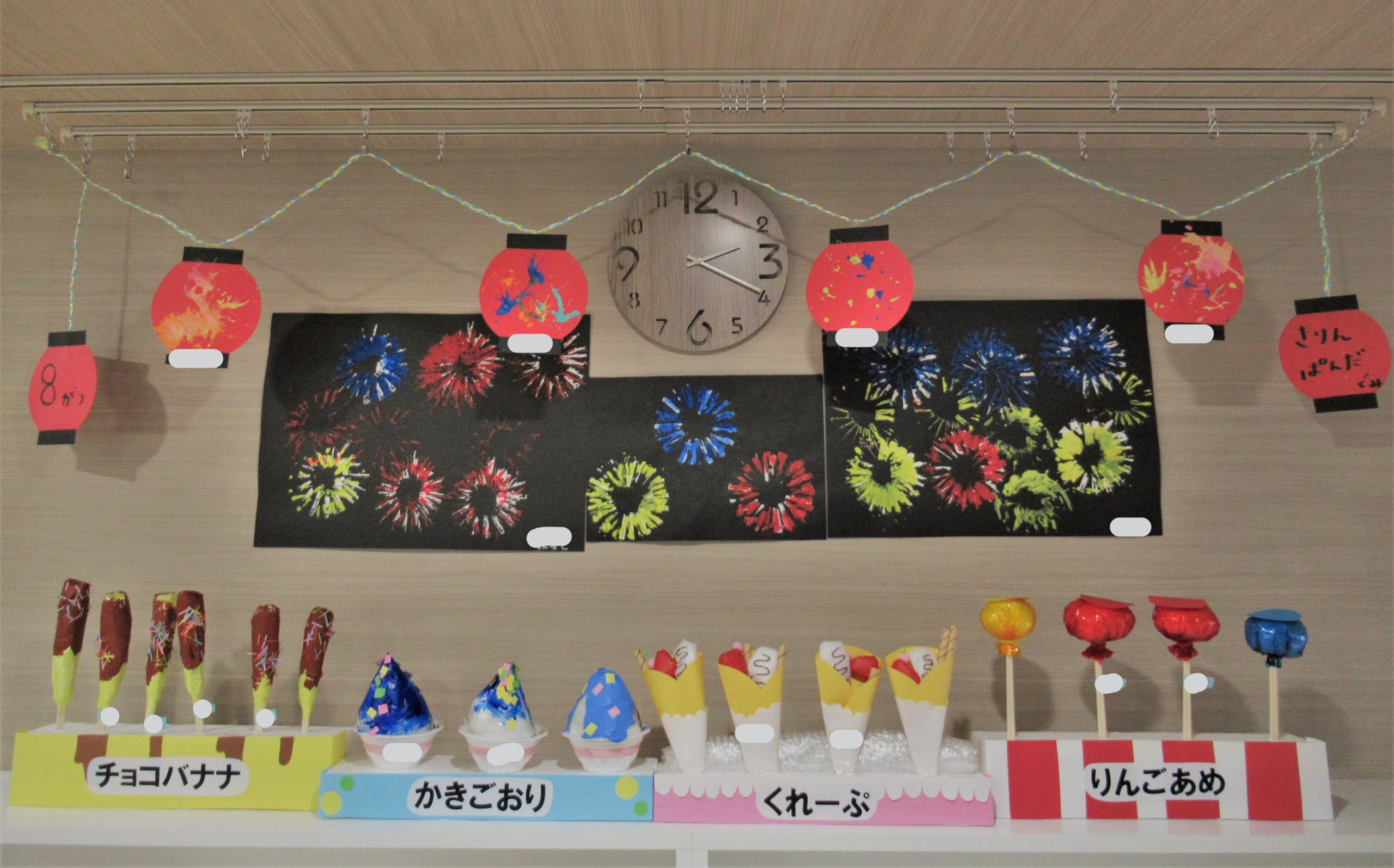壁面飾り 保育 夏 8月 花火 祭り りんご飴 チョコバナナ。