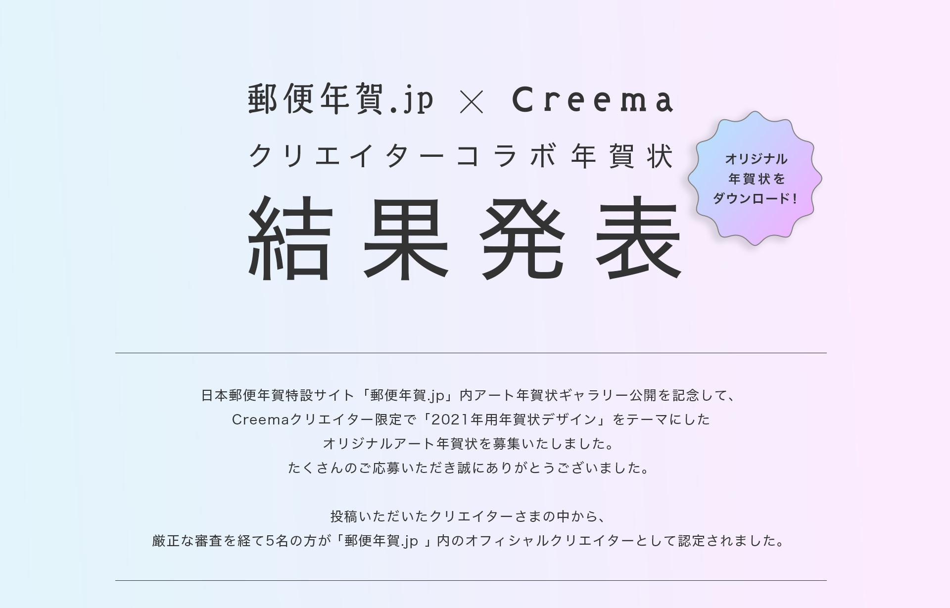 郵便年賀.jp × Creema クリエイターコラボ年賀状 結果発表Creema クリーマ国内最大のハンドメイドマーケットプレイス。