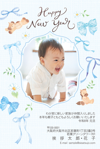 出産報告写真年賀状なら年賀家族 : 2026年・令和8年・午年の年賀状印刷。