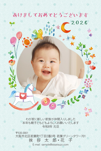 写真入り 赤ちゃんのおもちゃの出産報告年賀状bizocean ビズオーシャン。