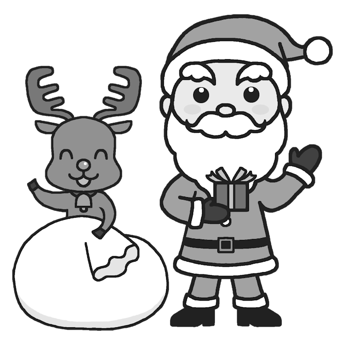 プレゼントを持ったサンタとトナカイの白黒イラストかわいい無料の白黒イラスト モノぽっと。