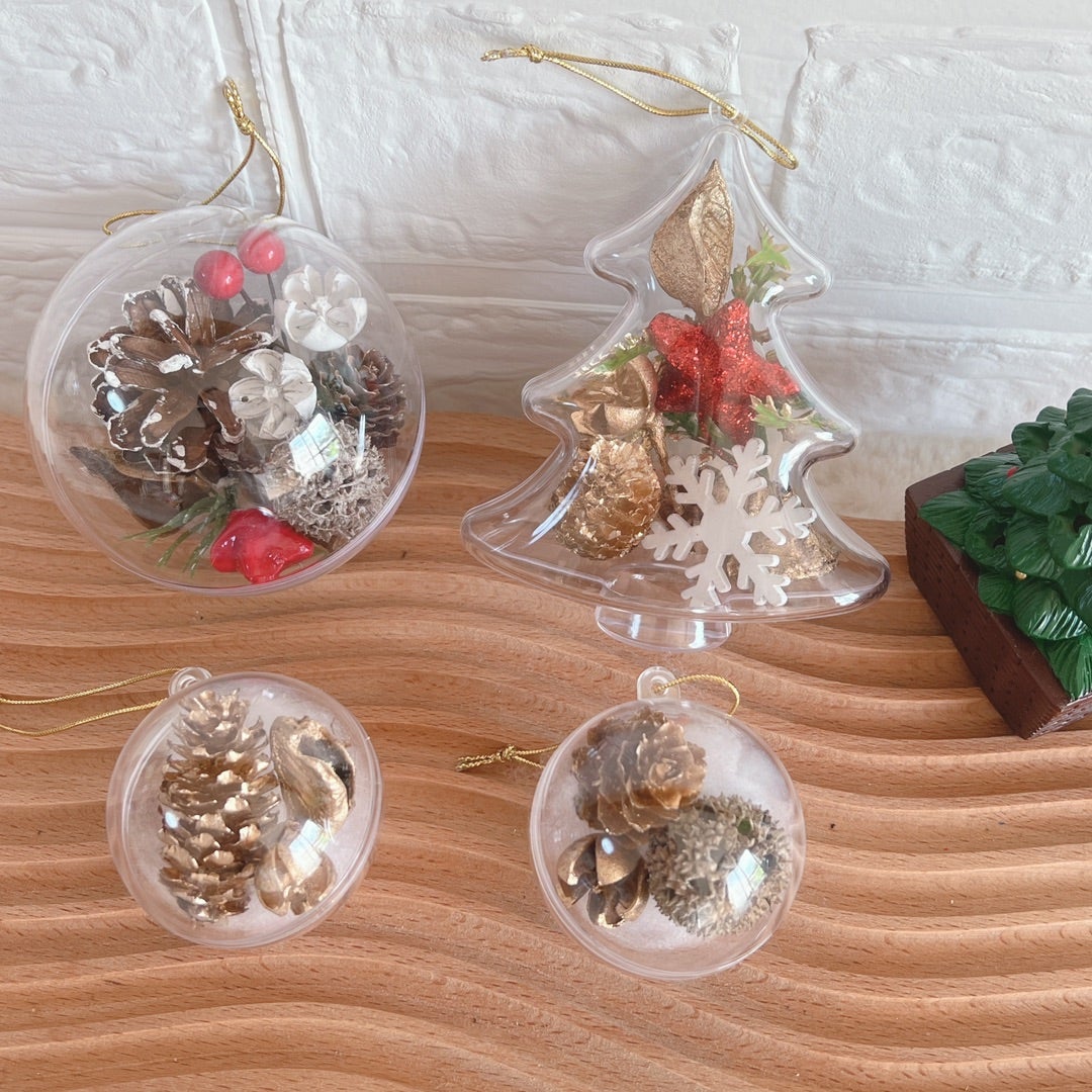 🍀手作りクリスマスオーナメント🍀ダイソー のクリアボール2種類を使って クリスマスオーナメントを作りました。プラスチックケースの中に 松ぼっくり や 木の実 を詰めてあります。中身も全てダイソーで購入しました。球形は中身を詰めるのが楽でしたが、ツリー型は。