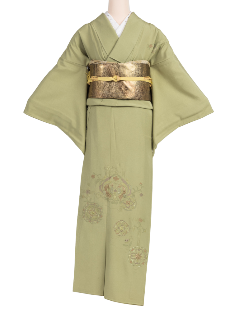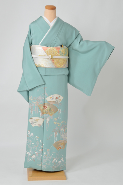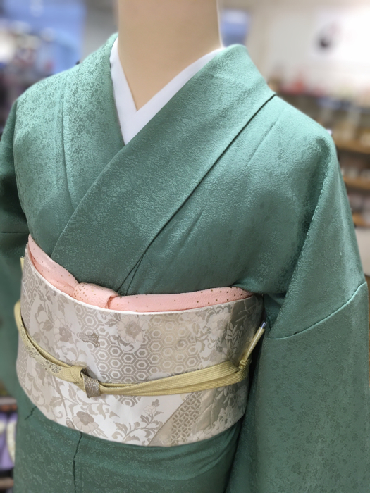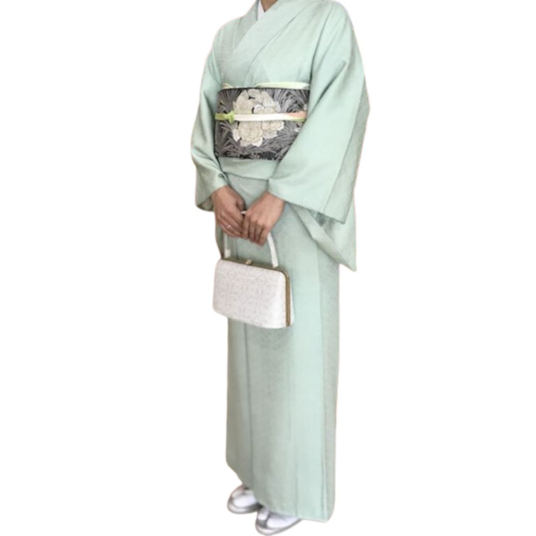 正絹色無地レンタル10033 ミントグリーン地紋正絹色無地 袋帯フルセット 身長158cm~173cm 着物レンタル「クワシ着物レンタル」。