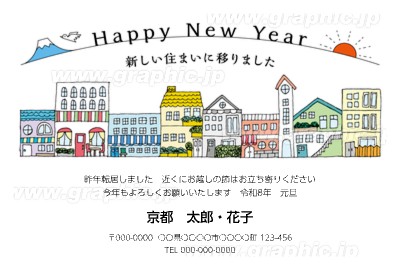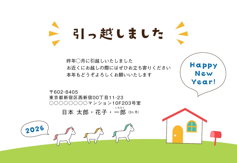 年賀状デザイン NKH057引越し報告・カジュアル・横向き2026年 午年の年賀状印刷はしまうまプリント。