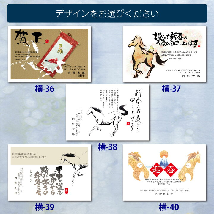楽天市場2026年版 年賀状印刷 オリジナルデザイン 横デザイン 10枚-300枚オリジナル年賀状 オリジナルデザイン 年賀状 印刷 年賀はがき官製はがき 名入れ 印刷済み きれい デザイン テンプレート豊富な可愛いキレイなデザイン 2026 令和8年 午年 ウマ年 馬年 うま。