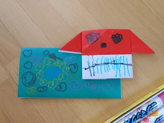 獅子舞の折り紙。簡単に幼稚園児でも顔と体が作れます。立体にも平面1月のお正月飾りにも最適です♪おりがみっこⅡ。