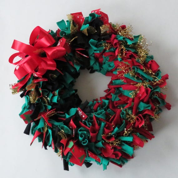 クリスマス ファブリック リース、幅 15 インチ、赤と緑のぼろ布リース、フリルのドア装飾、ファブリック ストリップ、布リース、赤いリボン、オーダーメイド- Etsy 日本。
