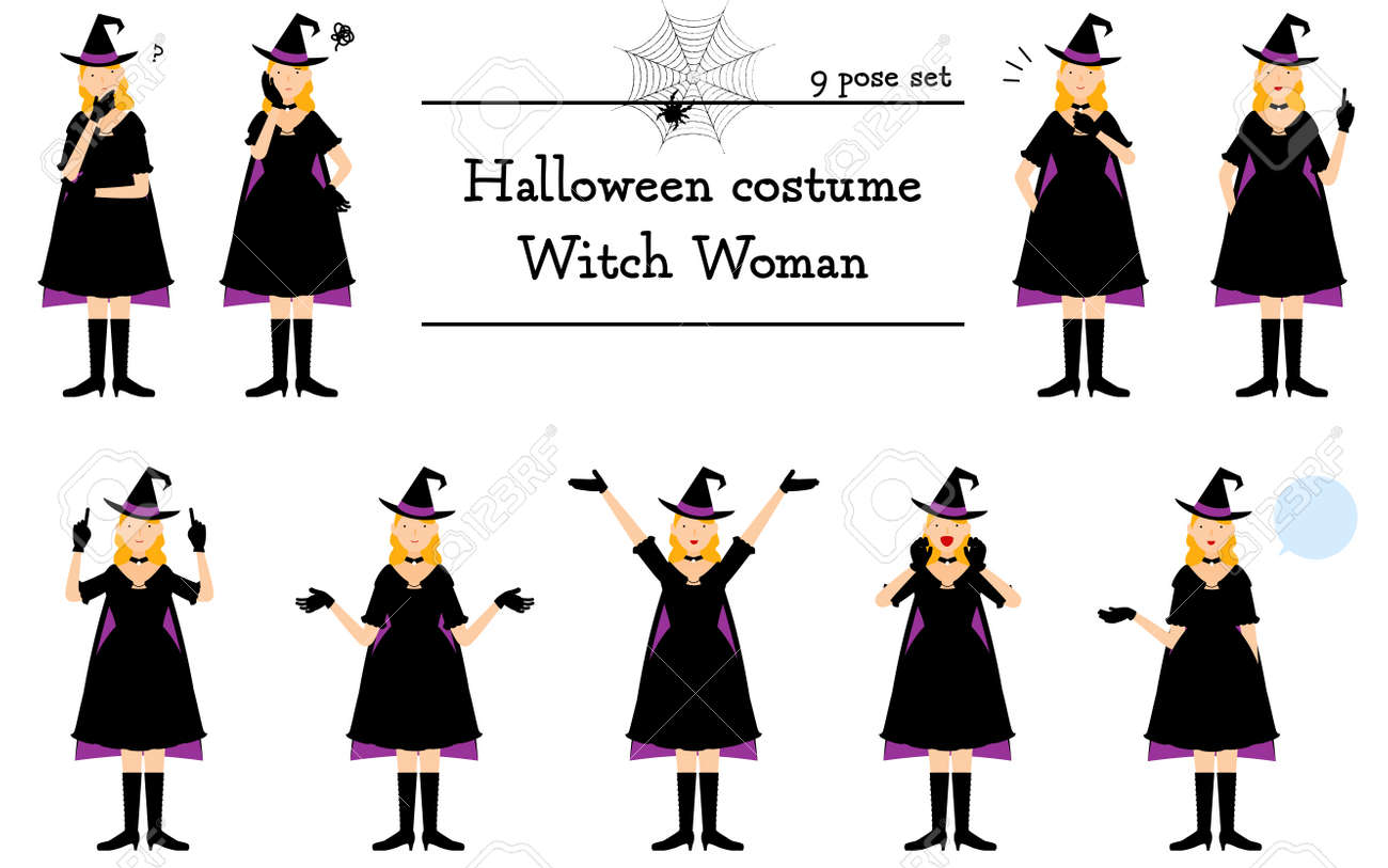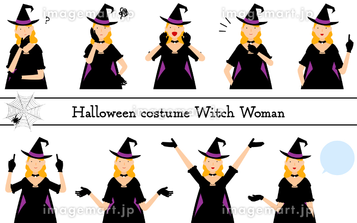 ハロウィーンの衣装、魔女の衣装を着た女性のポーズセット-話す、心配する、指さすなど。のイラスト素材・ベクター Image 173548433。