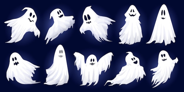 ハロウィーンの幽霊のセット さまざまなポーズのハロウィーンの恐ろしい幽霊 不気味な飛行ファントム幽霊Premiumベクトル素材。