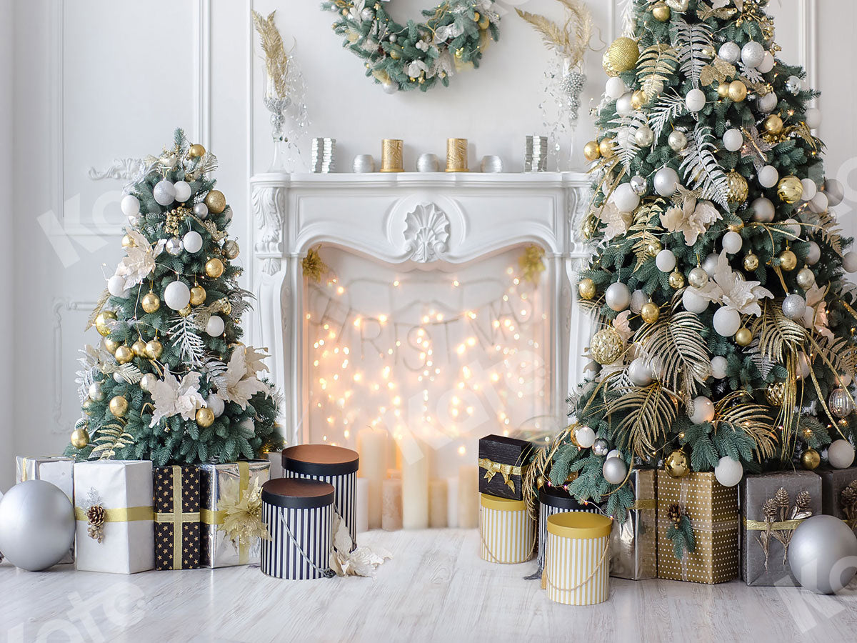ケイトクリスマス暖炉写真背景幕ウィンドウツリーホリデーシーンブラウンウッドフロア写真背景家族のクリスマスルームセット写真小道具 8× Kateゴールデンボールクリスマスツリー暖炉背景 - 3M W x2M H。