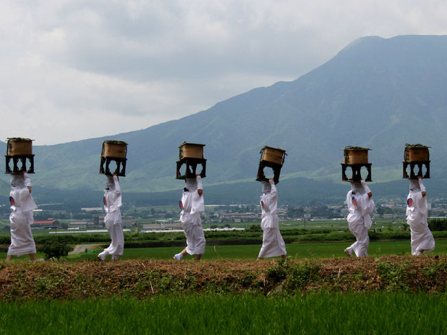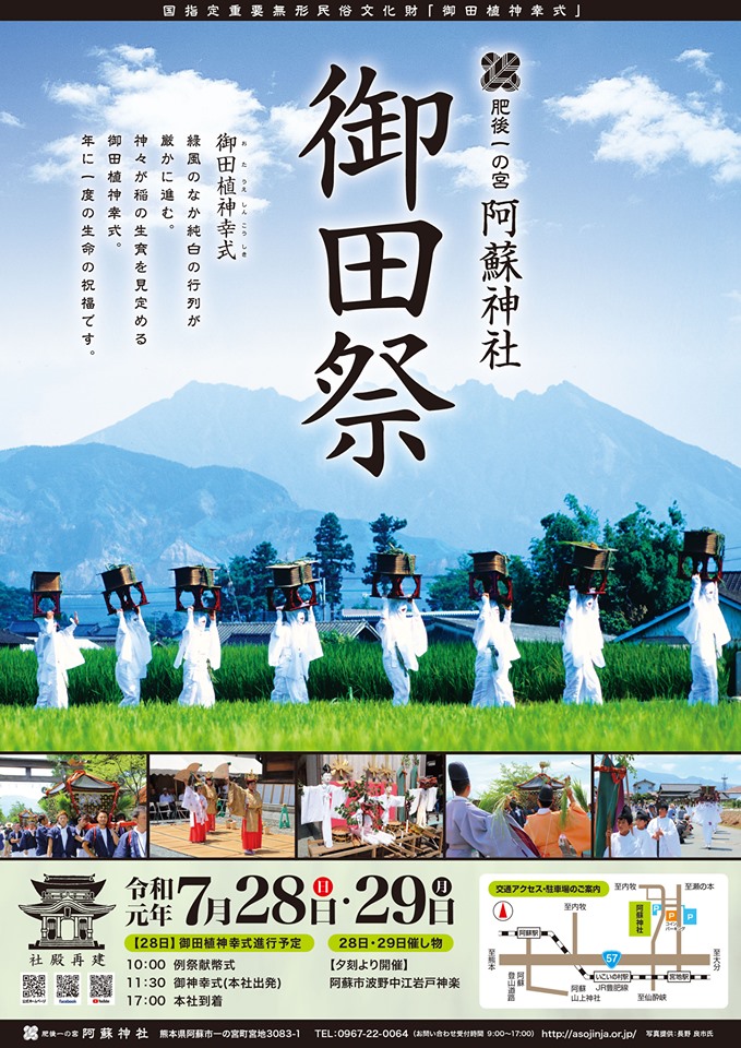 阿蘇神社 御田祭 おんだまつり阿蘇神社に祀られている12の神々が4基の神輿に乗って行列を構成し、神社周辺の青田をめぐり生育具合を見分する行事です。お供をするのは、全身白装束の女性 宇奈利うなり など、約200人の行列です。行列が進む間に田歌が謡われ、2カ所。