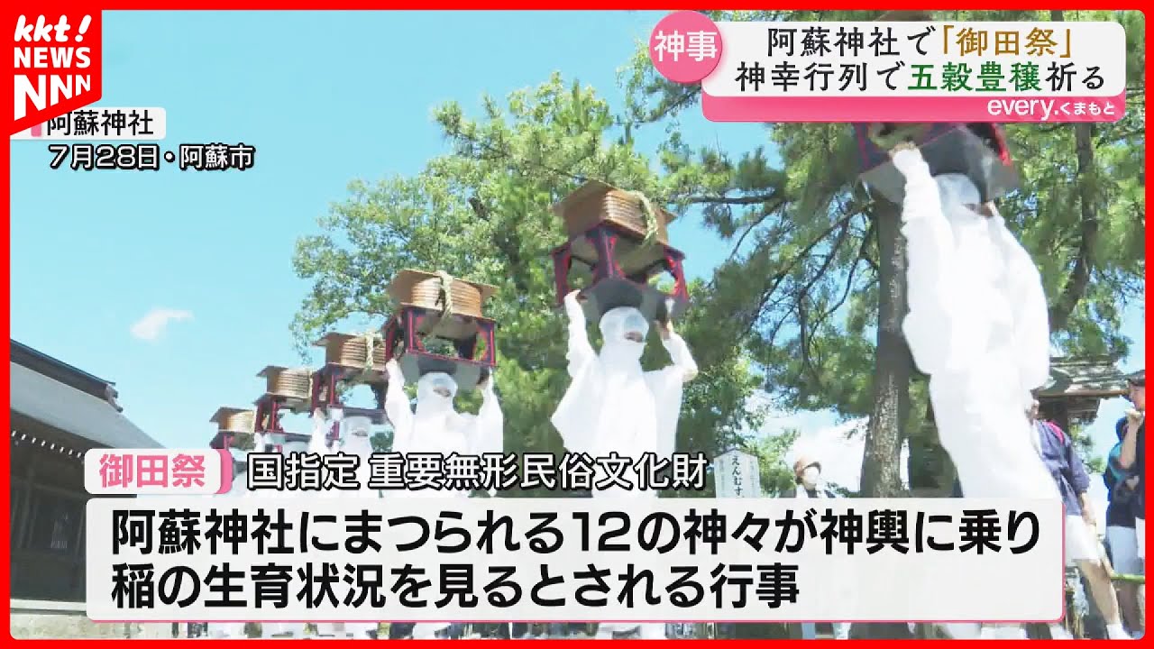 熊本県阿蘇市の情報をお届けするアソプラス。, 今回は、お祭り情報!, 7月28日に、阿蘇神社で御田祭が行われます。,御田祭は阿蘇神社の神様が4基の神輿に乗って青田をめぐり生育具合をみてまわる行事です。,お供をするのは、全身白装束の女性「宇奈利」 うなり など約200人!,また、2カ所の御旅所では古くから伝わる田歌が歌われる中、稲を神輿の屋根に向かって投げ上げる田植式が行われます,。
