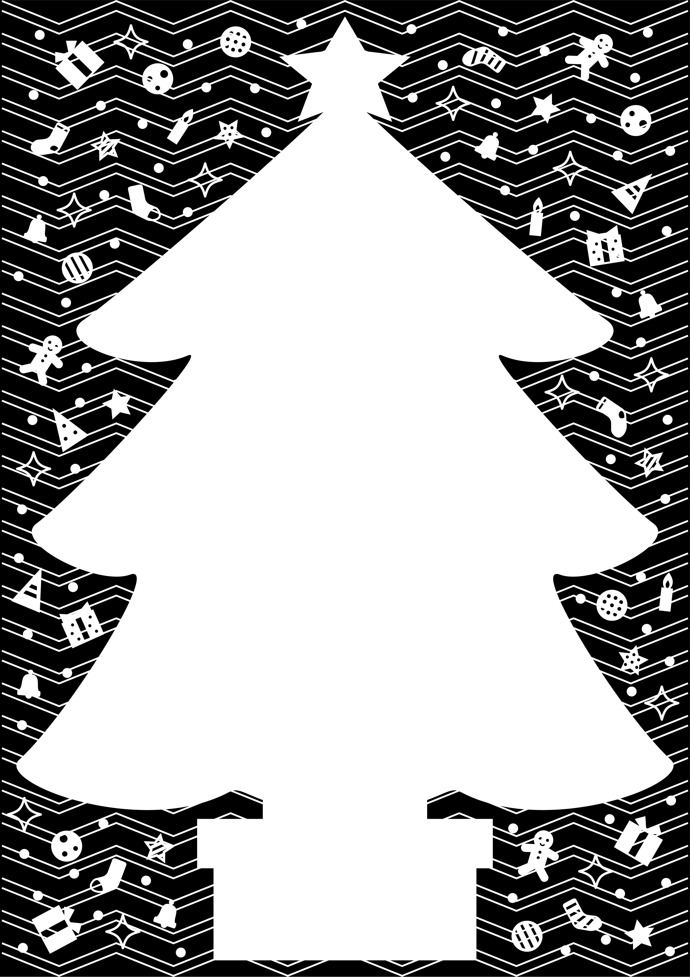クリスマスカード-白黒テンプレート クリスマスツリー<無料>かわいいフリー素材 イラストK。