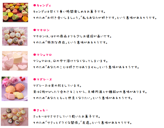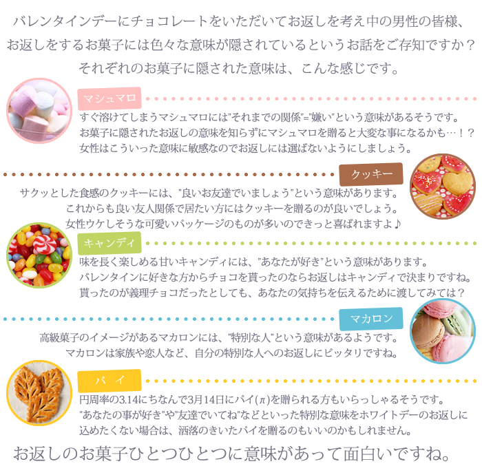 ホワイトデーのお返しに贈るお菓子の意味一覧 - バレンタイン&ホワイトデー限定商品・ギフト情報まとめ。
