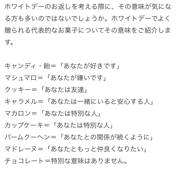 Sermal on X: "なんか、ホワイトデー💝のお返しの意味 があってか、ポジティブな意味合いをもったお菓子🍪と言われているそうだけど、知らずにあげると、大変な事になると言うけれど、相手側は意味とか知らない事も多々あるそうなので、必ずしもではないので・多分。