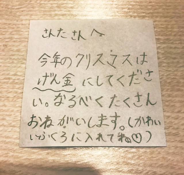 今年のクリスマスはげん金にしてください」 サンタへ現実的すぎる娘の手紙に父衝撃まいどなニュース。