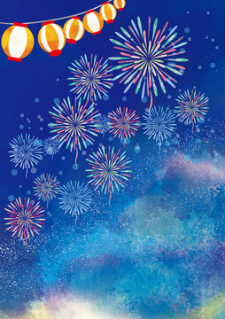 花火と夏祭り大太鼓に紅白の輝く提灯と祭りのうちわのイラスト縦スタイル背景素材のイラスト素材65352446- PIXTA。