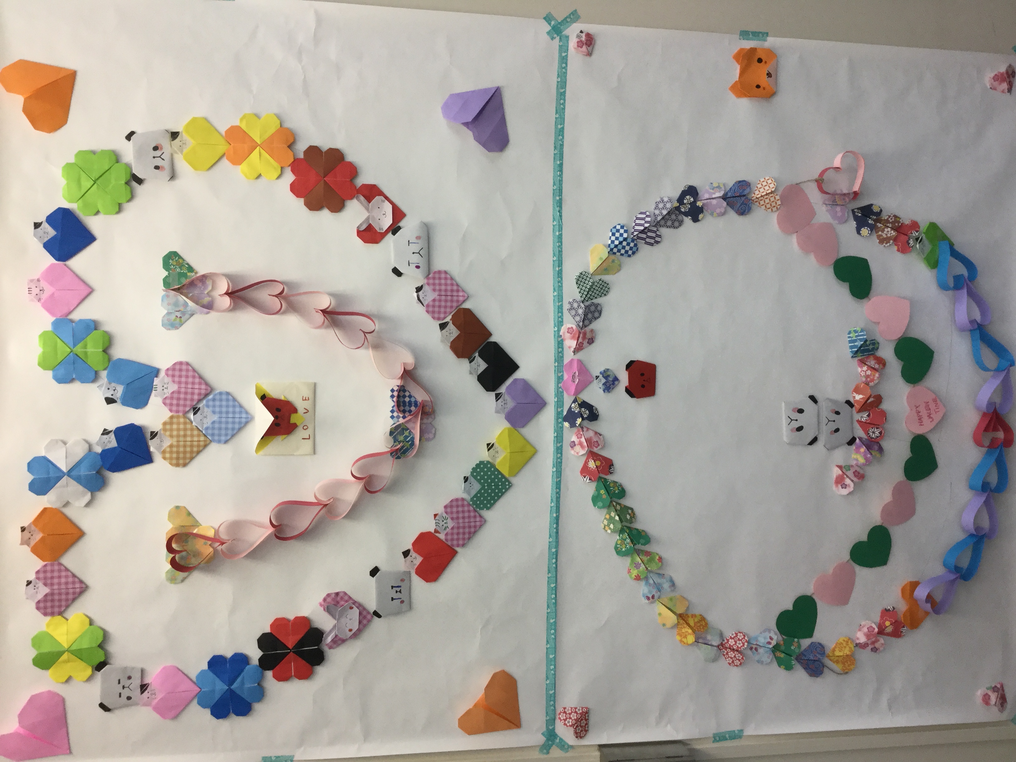 工作ネタ バレンタインデー壁面飾りハートVarentine’s Day wall decoration 2月高齢者レクデイ作業療法OT 保育創作紙テープ簡単ハート。