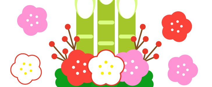 とても華やかなお正月にふさわしい門松のワンポイントイラスト、3色の梅の花がかわいい素材無料イラスト素材TemplateBox。